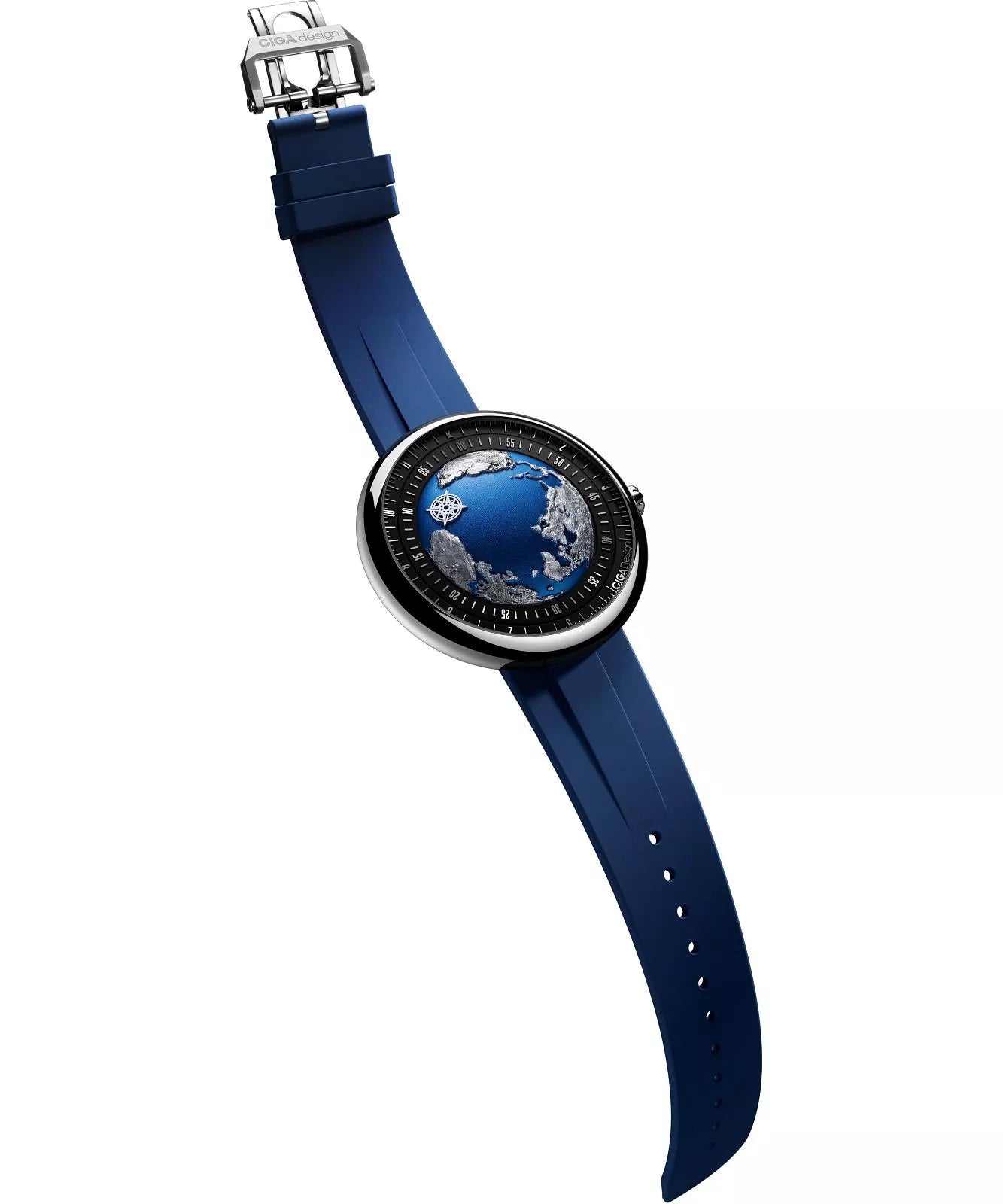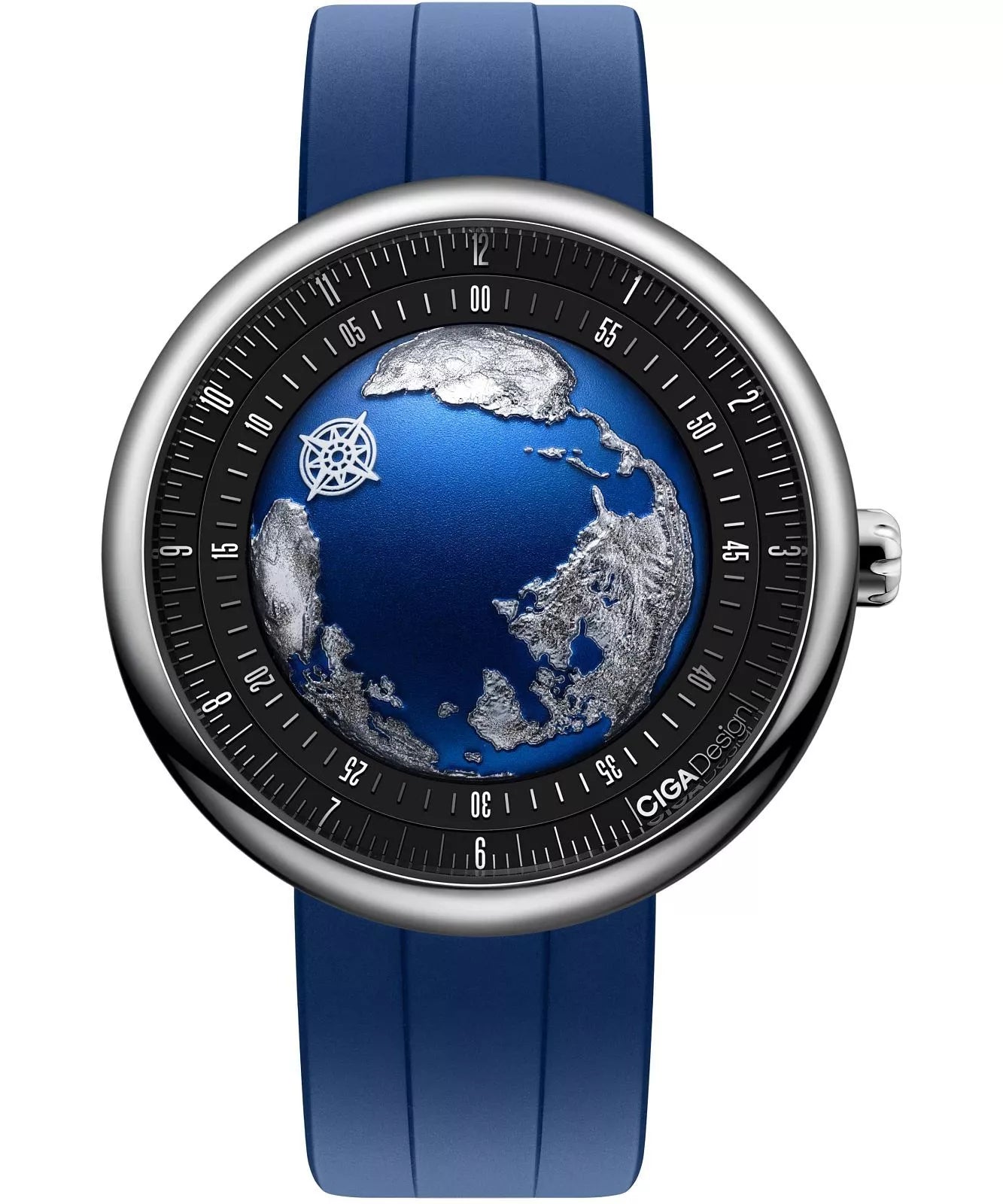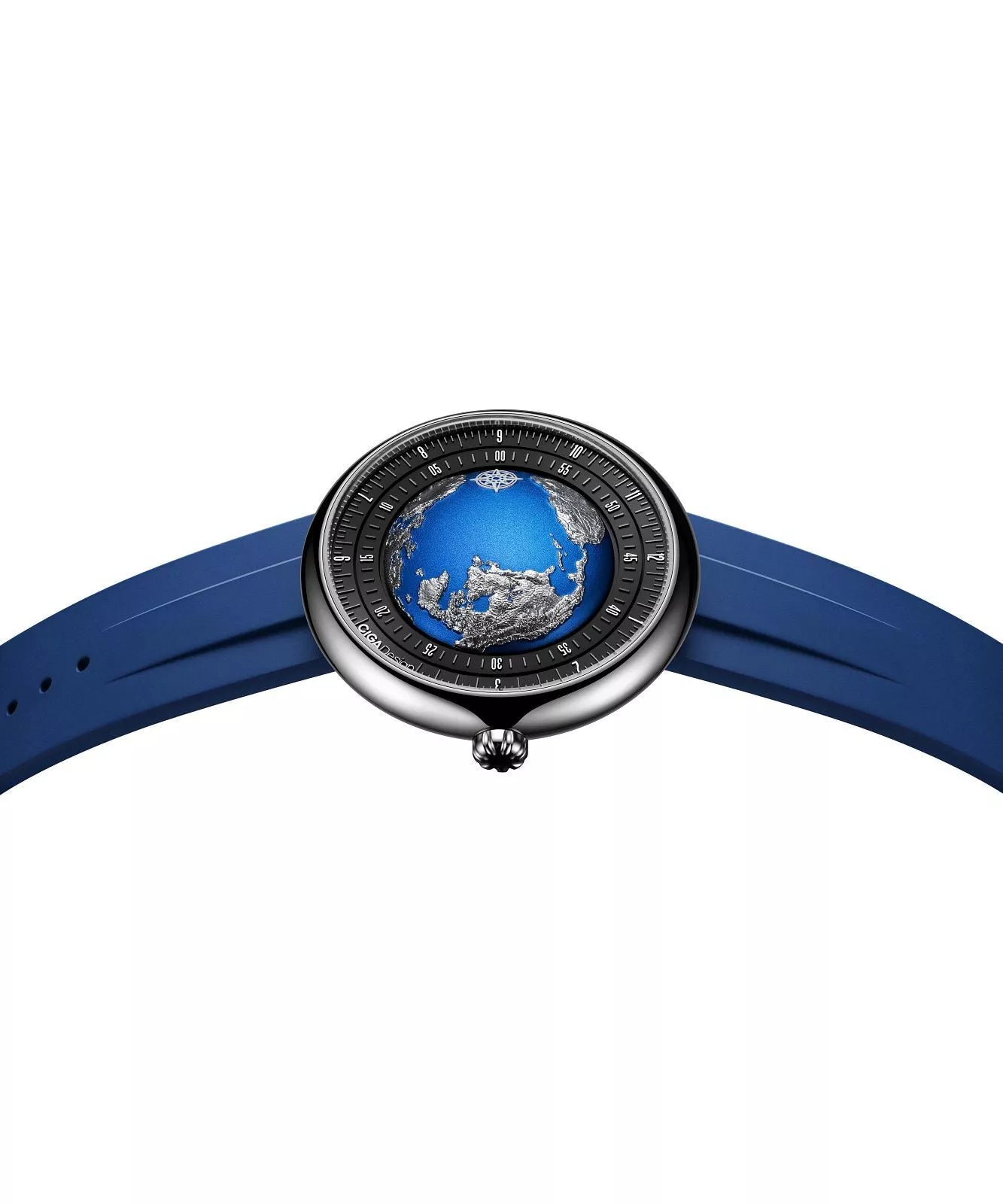 The CIGA Design Blue Planet II (U039-TU01-W6U) is a 46 mm titanium automatic watch featuring a blue globe-inspired dial and a unique Asynchronous-Follow time display, blending artistic design with mechanical precision.